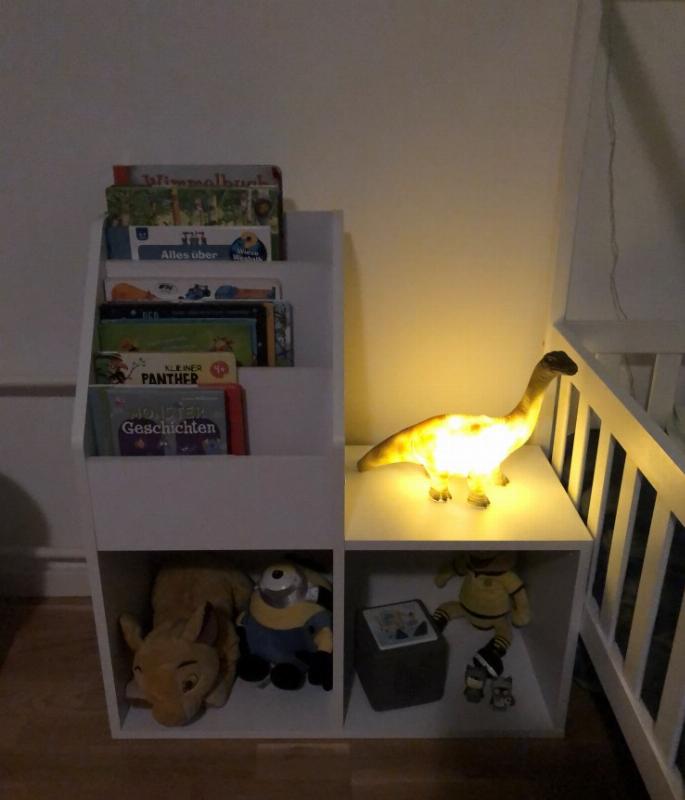 » Wir sind mit dem Regal sehr zufrieden. Es ist am Abend immer sehr praktisch, wir haben die Bücher für die gute Nacht geschicht bereit , ein kleines Schlummerlicht und für die Nacht passt immer noch ein Glas Wasser hin. Die liebsten Kuscheltiere sind auch griffbereit.