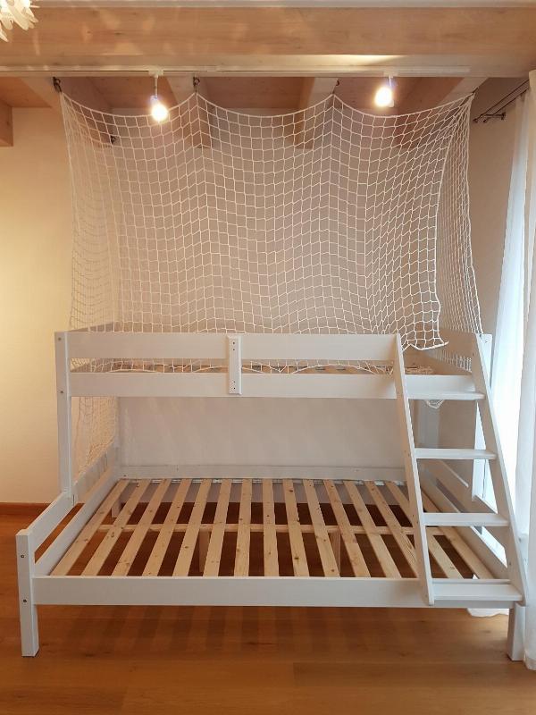 Wir haben die Seiten mit einem Sicherheitsnetz umspannt. Eine perfekte Lösung, es war die Arbeit wert! Unsere drei Kids (1 Jahr, 3 Jahre, 6 Jahre) spielen sehr gerne zu dritt oben. Auch das Toben ist möglich und die Eltern haben ein gutes und sicheres Gefühl. Wir haben die Befestigung mittels Karabinerhaken gemacht, an einigen Stellen fixierten wir das Netz zusätzlich mit Kabelbindern. Die Karabinerhaken erlauben ein leichtes Abnehmen des Netzes wenn das obere Bett neu bezogen werden muss.