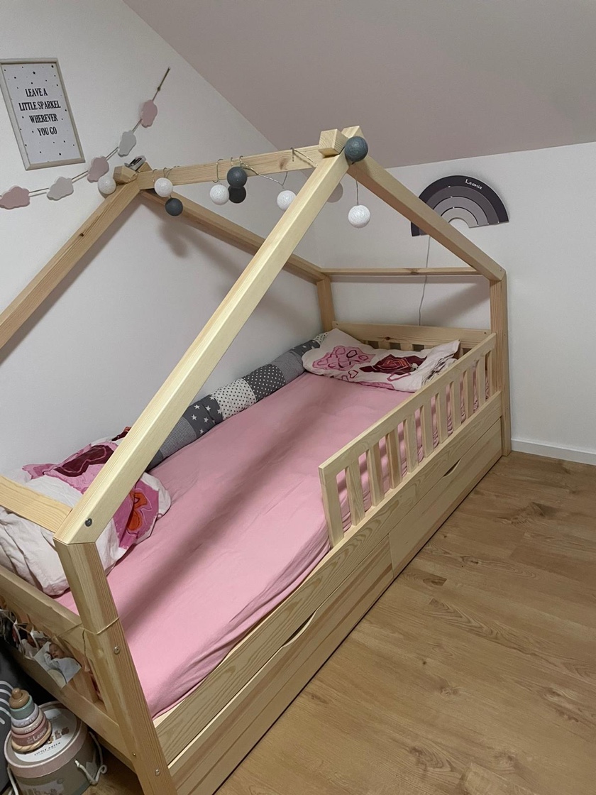 Optimales Design für ein Holzbett für das Kinderzimmer - eine gute Entscheidung für jedes Haus. Freude an der Benutzung garantiert.Dieses Bett aus Holz ist ein Highlight im Kinderzimmer. Es bietet einen fantasievollen Ort für Kinder, um ihre Kreativität auszuleben und überzeugt durch hohe Qualität.MAßE: Das Kinderbett ist passend für Matratzen 160 x 80 cm und hat eine Höhe von 134 cm. Die detaillierten Größen der einzelnen Teile sind auf den Fotos angegeben.MATERIAL: Das Spielbett für Kinder besteht aus natürlichem KiefernholzLIEFERUMFANG: Spielbett, Montageanleitung, Montagematerial, 2x Schubladen, Matratze.Das Hausbett ist mehr als nur ein Kinderbett aus Holz. Es ist ein Spielbereich und eine Quelle der Inspiration. Hier kann Ihr Kind seine Fantasie und Kreativität entfalten und in eine Welt voller Abenteuer eintauchen. Mit seinen zwei Schubladen und einer Matratze bietet dieses Holzbett für Kinderzimmer auch praktischen Stauraum. Es ist ein Highlight im Kinderzimmer und zieht alle Blicke auf sich. Das Bett ist von hoher Qualität und in verschiedenen Ausführungen und zusätzlichen Veredelungen erhältlich. Das Hausbett ist das perfekte Spielbett für Kinder und ein gemütlicher Ort zum Schlafen. Gönnen Sie Ihrem Kind dieses unverwechselbare Design und schaffen Sie ein Zuhause, in dem es sich wohlfühlt und sein eigenes Reich erkunden kann.---Technische Details:Farbe:NaturholzAbmessungen:80 x 133.6 x 160 cm (BxHxT)Material:Holz (Kiefer)Artikelgewicht:47.13 kg.Artikelgewicht inkl. Verpackung:50.1 kg.---LIEFERUMFANG: Spielbett, Montageanleitung, Montagematerial, 2x Schubladen, Matratze.Die Möbelserie "Design" bietet Spielbetten in Hausform für Kinder. Mit einer Vielzahl von Farbkombinationen und verschiedenen Konfigurationsoptionen bietet sie eine breite Auswahl an Möglichkeiten. Gestalten Sie den Schlafbereich Ihres Kindes mit den vielfältigen Optionen der Serie "Design" und schaffen Sie eine spielerische und gemütliche Umgebung.