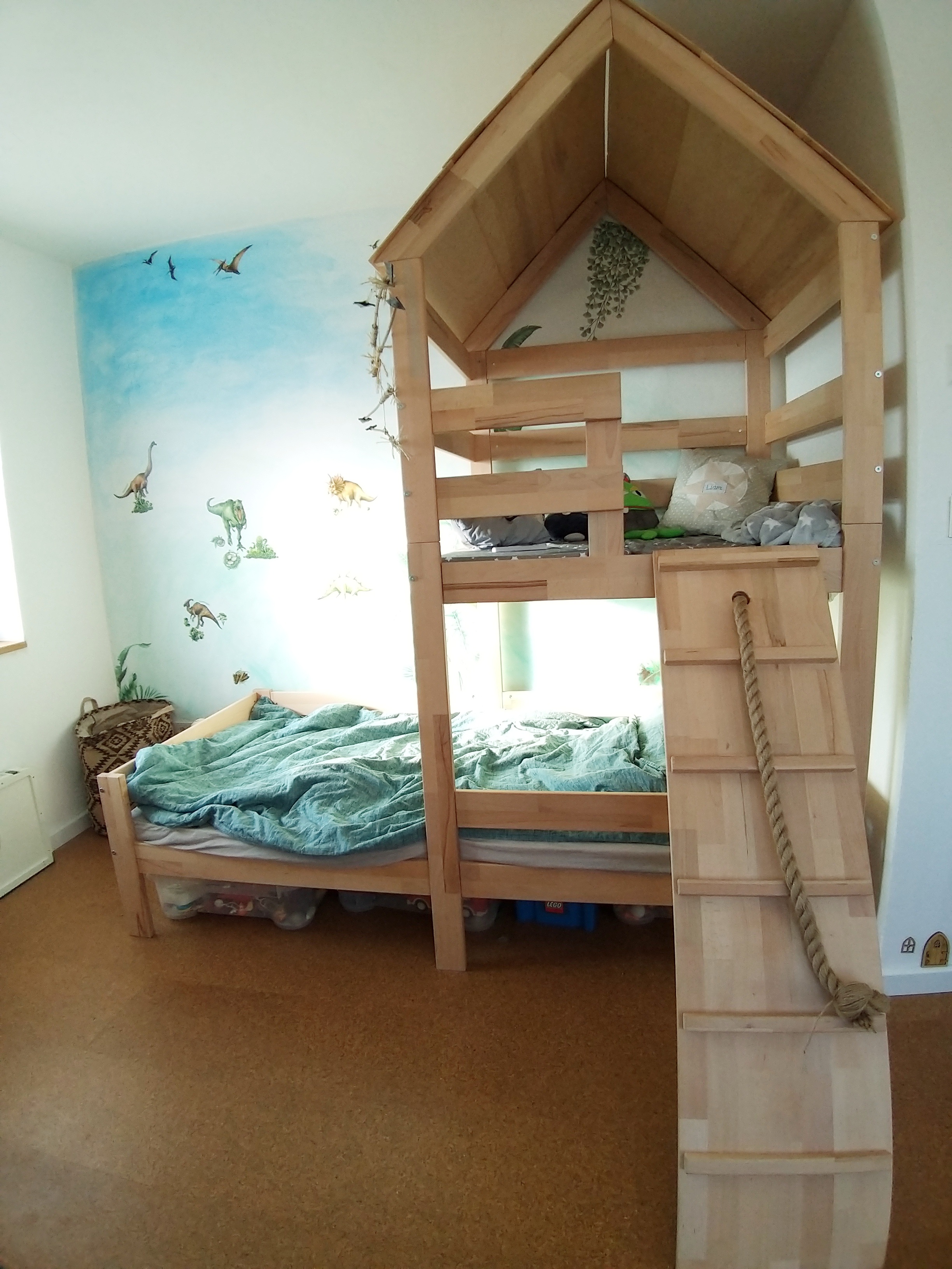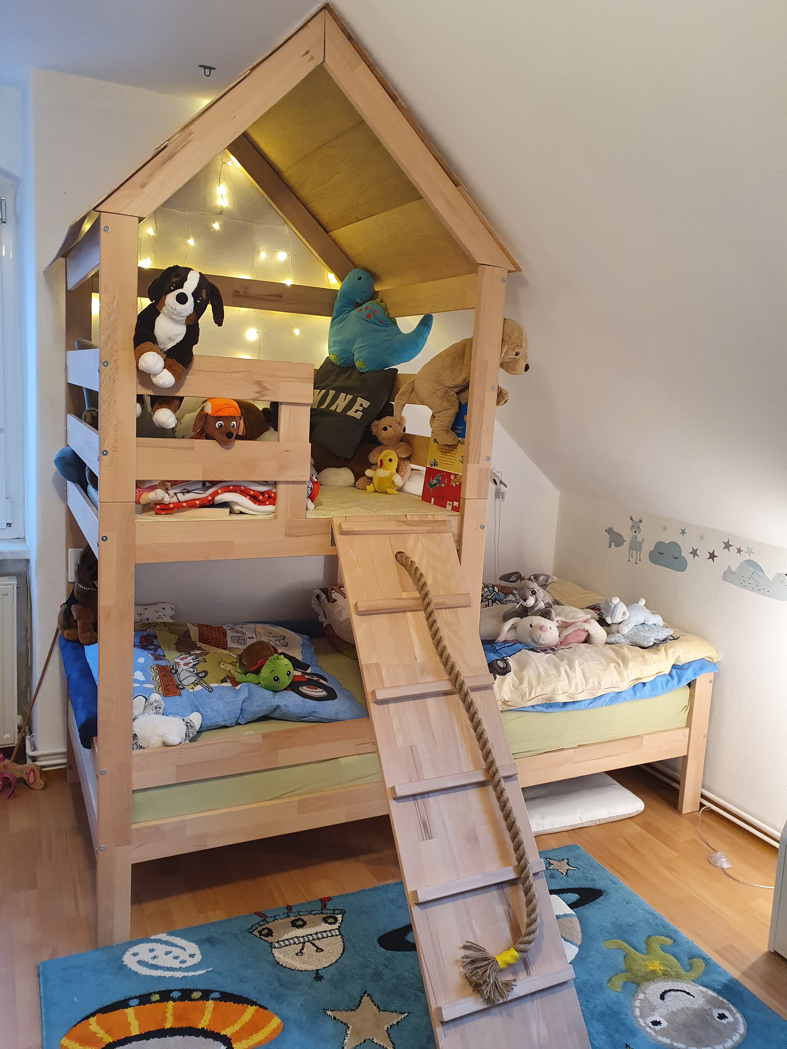 Wir haben das Bett gewählt, da wir aufgrund von Dachschrägen kein normales Hochbett stellen konnten und an dieser Wand auch das Fenster geöffnet werden soll. Daher ist das Bett mit Spielturm (spiegelverkehrt aufgebaut) perfekt für unser Kinderzimmer. Tipp für den Aufbau: den Turm auf das Bett aufbauen und nicht im ganzen wie in der Beschreibung draufheben. Das wäre bei unserer Raumhöhe nicht gegangen und wäre für zwei Frauen auch ganz schön schwer geworden!