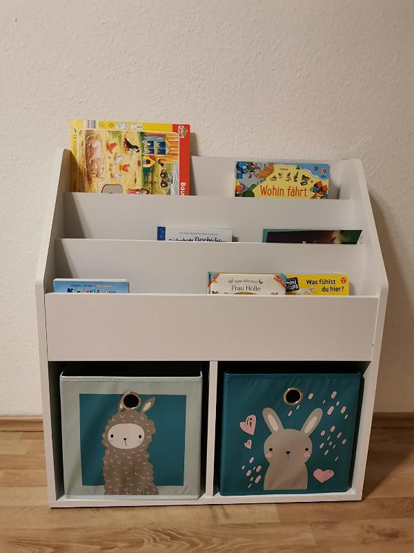 » Dieses Kinderregal bietet viel Stauraum für Spielzeug und Bücher. Das design ist hübsch gestaltet mit den Bedruckten Boxen. Allgemein macht das regal einen hochwertigen Eindruck. Allerdings ist der Aufbau recht kompliziert. Es ist zu Anfang nicht einfach zu erkennen welches Teil in der Anleitung gemeint ist. Besonders störend fand ich, dass die Rückwand mit Schrauben anstatt Nägeln befestigt wird. Die Schrauben rutschen schnell weg und man muss sehr viel Kraft aufwenden. Dadurch habe ich versehentlich zwei unschöne Löcher in die Rückwand gebrochen.