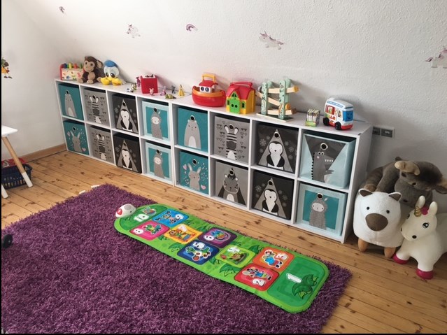 - Das Spielzeugregal für Faltboxen bietet Platz für Spielzeug, Bücher und Dekoration. Mit 8 offenen Regalen und Ablagen für 30x30 Kartons sorgt es für Ordnung im Kinderzimmer.