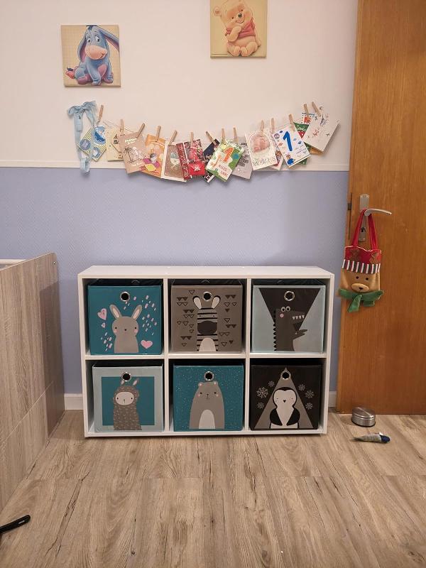 » Ein schönes Regal. War auch leicht aufzubauen. Einzig negativer Punkt ist, das die Teile nicht gekennzeichnet sind so das man jedes Brett selber ausmessen muss, was halt mehr Zeit in Anspruch nimmt, ansonsten bin ich sehr zufrieden. Die Kisten sind auch super niedlich gestaltet