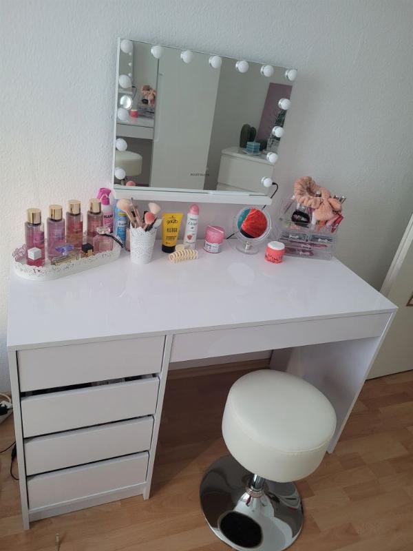 » Unsere Tochter ist total glücklich mit ihrem Tisch und nutzt ihn als Schreibtisch und Schminktisch. Ferienbedingt wird er im Moment intensiver als Schminktisch genutzt und dekoriert.:-) Super sind die kleinen Schubladem auf der linken Seite für Kleinigkeiten und die große Schublade, um allerlei Stifte und den Laptop zu verstauen.