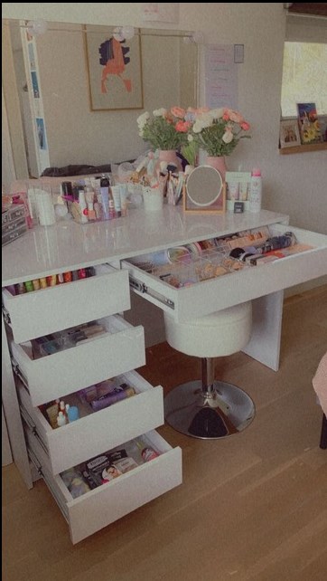 » La coiffeuse est magnifique, elle a transformé ma chambre. L’éclairage est doux mais efficace, et tout mon maquillage tient dans les tiroirs.