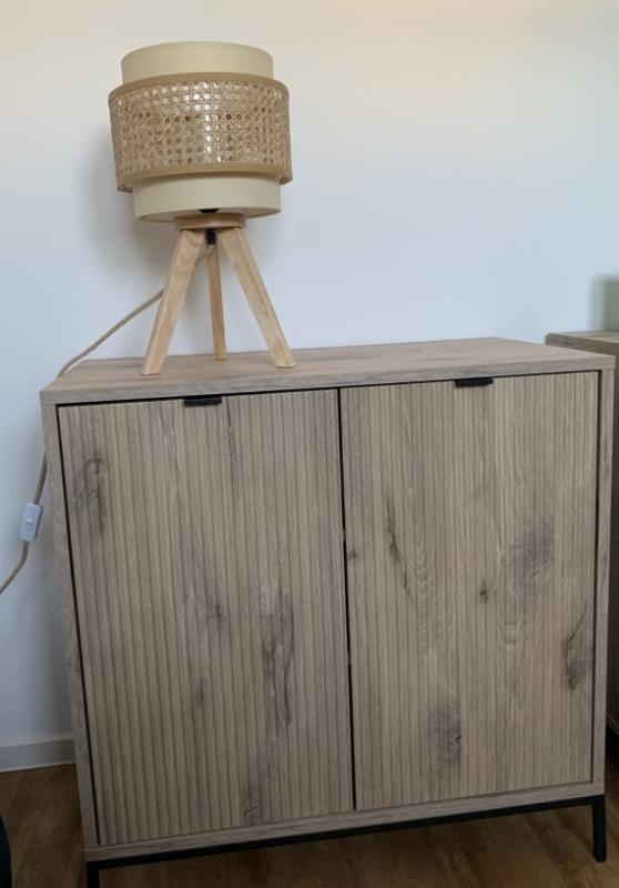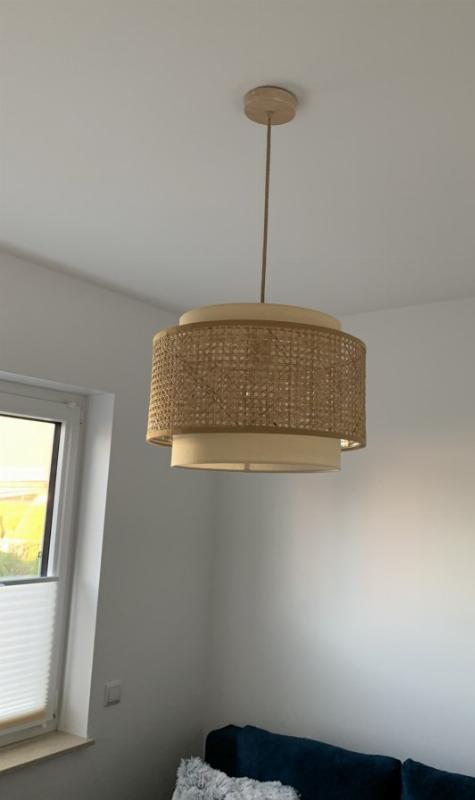 » Die Lampe sieht in echt noch schöner aus als auf den Bildern – das Rattan-Muster sorgt für ein super warmes Licht, und der Holzfuß macht einen hochwertigen Eindruck.