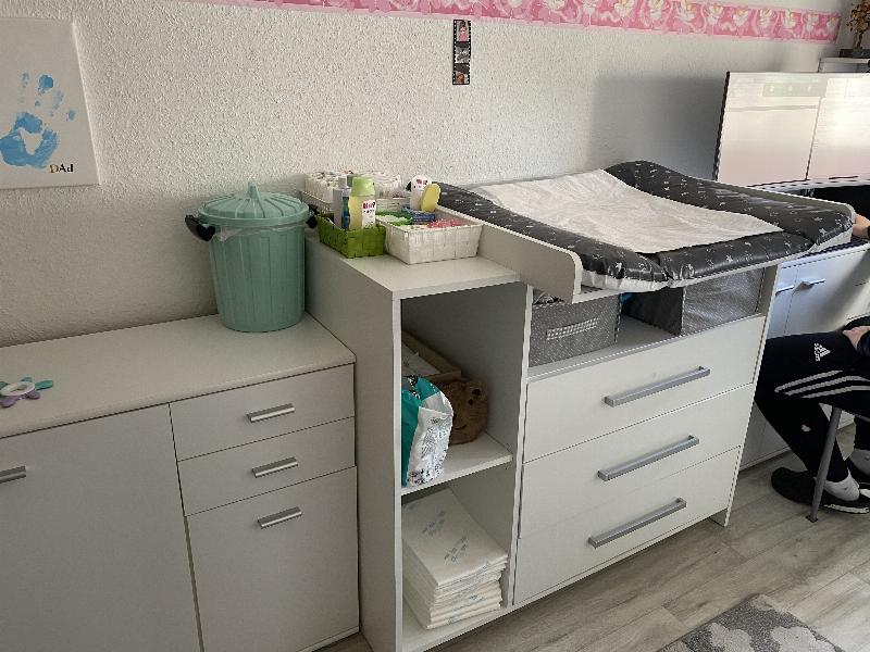 » Der Wickeltisch gefällt uns sehr gut. Wir mögen die Schubladen auf dem Wickeltisch, weil dann die Kleidung des Kindes in Reichweite ist. Uns gefällt, dass es neben der Arbeitsfläche Stauraum gibt. Der Wickeltisch kann später abgenommen und als Wickeltisch verwendet werden. Besonders gut gefallen uns die Seitentaschen auf der linken Seite für Feuchttücher, Wickelauflagen und alles andere, was man für ein Baby braucht. Unter dem Wickeltisch ist die Oberfläche sehr praktisch, wie zu Hause, um Boxen usw. zu benutzen. Der Wickeltisch ist flexibel einstellbar.
